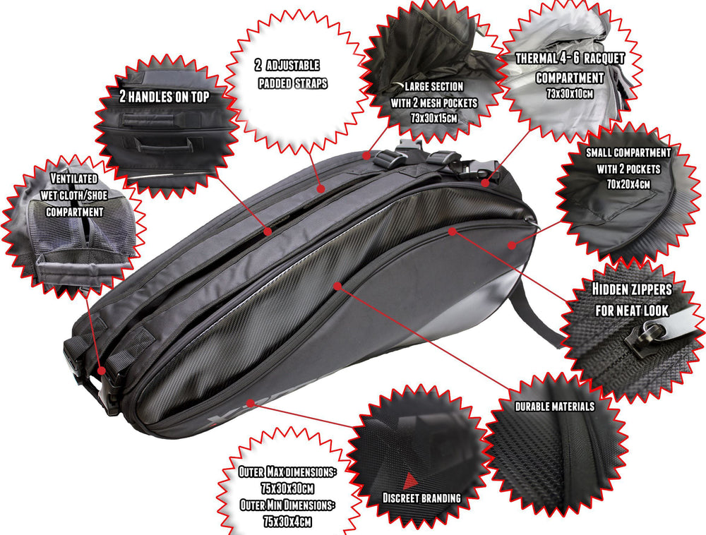 - 2 Main compartments to store apparel and equipment, including up to 6 rackets