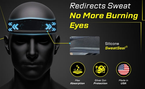 - SweatSeal ® exclusif redirige la transpiration vers l'arrière et loin de votre visage, de vos yeux et de vos lunettes